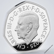 The Obverse is the portrait of King Charles III by Martin Jennings. Legend "CHARLES III D G REX F D 50 PENCE 2025".