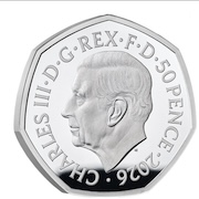 The Obverse is the portrait of King Charles III by Martin Jennings. Legend "CHARLES III D G REX F D 50 PENCE 2026".Limited Edition is 3,500 with a maximum mintage of 6,810.