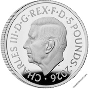 The Obverse shows a bare head portrait of King Charles III by Martin Jennings. Legend is "CHARLES III D G REX F D 5 POUNDS 2026".Maximum coin mintage is 4,010.